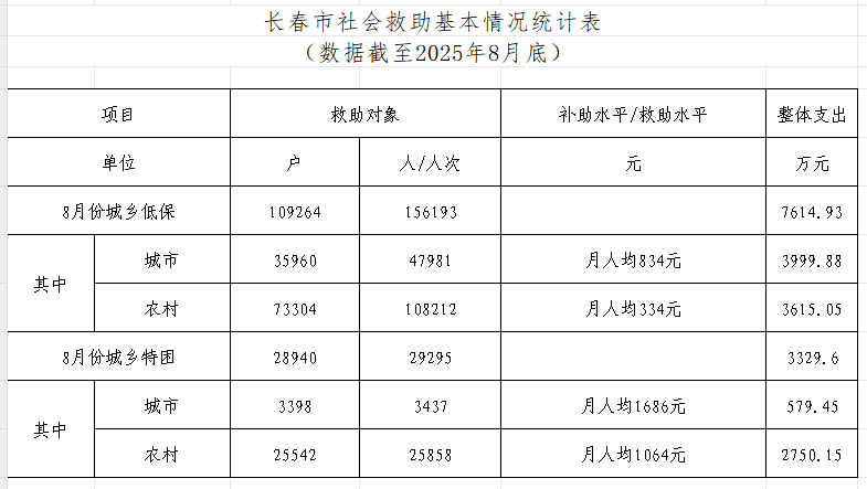 2025年8月,长春市救助138204户185488人。其中:低保109264户156193人,特困28940户29295人。