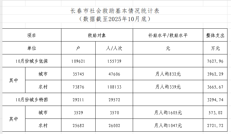 2025年10月,长春市救助138832户185311人。其中:低保109621户155739人,特困29211户29572人。