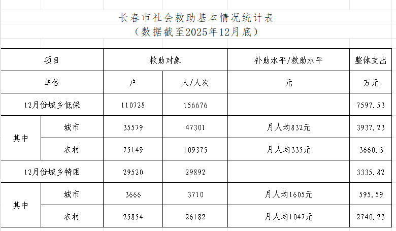 2025年12月,长春市救助140248户186568人。其中:低保110728户156676人,特困29520户29892人。